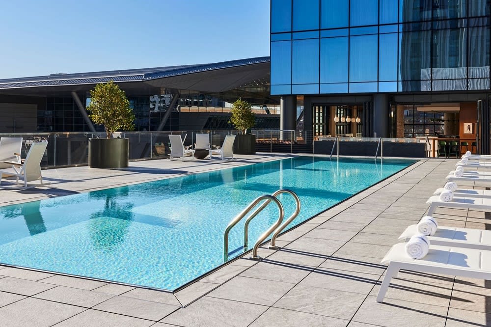 For a unique dining experience, hotels on a club floor offer seamless access to an elegant lounge with complimentary continental breakfast, an American brasserie serving farm-to-table fare, and evening hors d'oeuvres. Other amenities include 24/7 room service, 23,000-square-foot conference space, paid Wi-Fi, and a 24-hour rooftop fitness center.