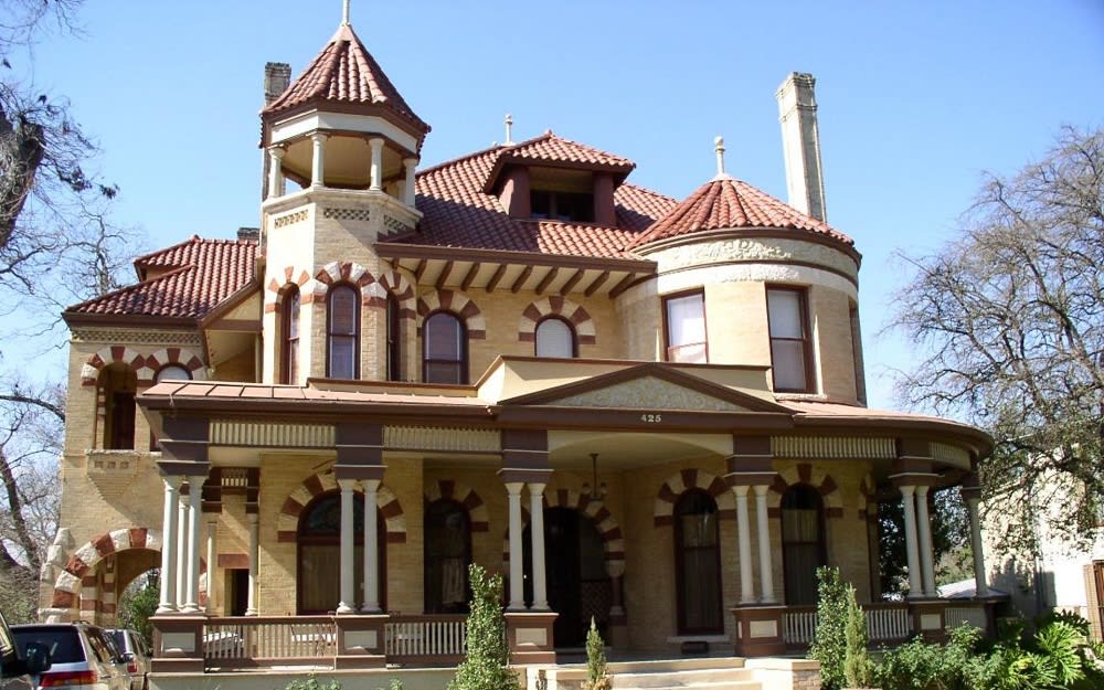 - A townhome with ornamented windows, doorways, and porches
