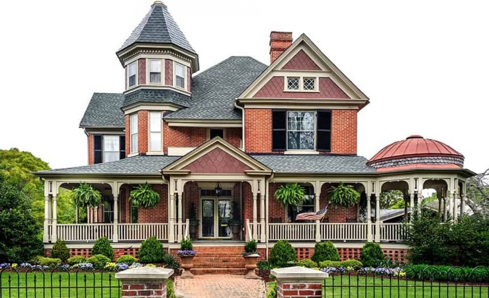 - A wrap-around porch with decorative columns or other ornamentation